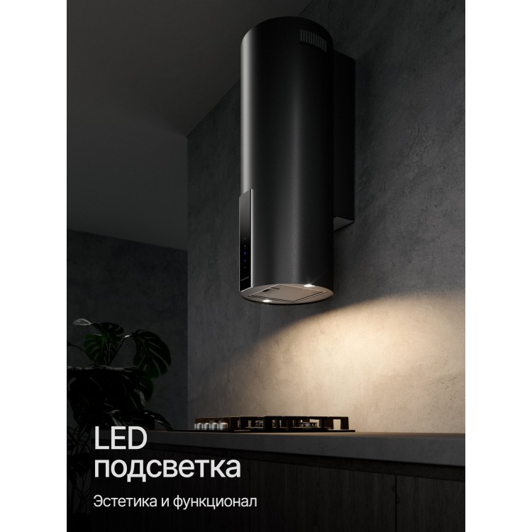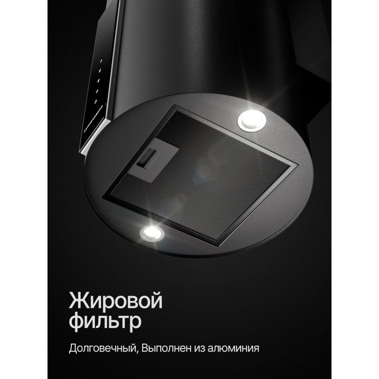 Управление вытяжкой осуществляется с помощью сенсорных кнопок. Освещение — светодиодное.