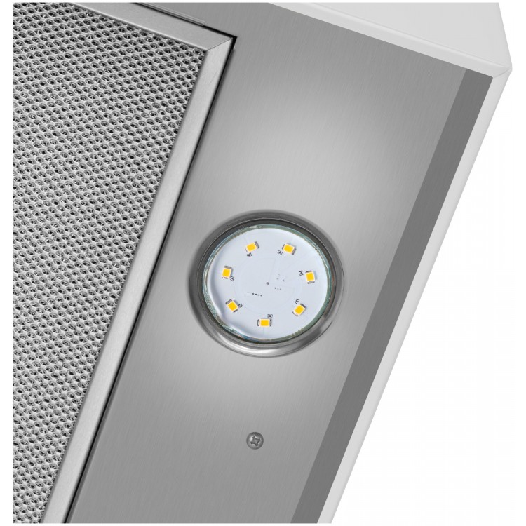 Вытяжка работает в режимах отвода и циркуляции, оснащена светодиодным освещением и кнопочным управлением. Диаметр патрубка воздуховода составляет 150 мм.