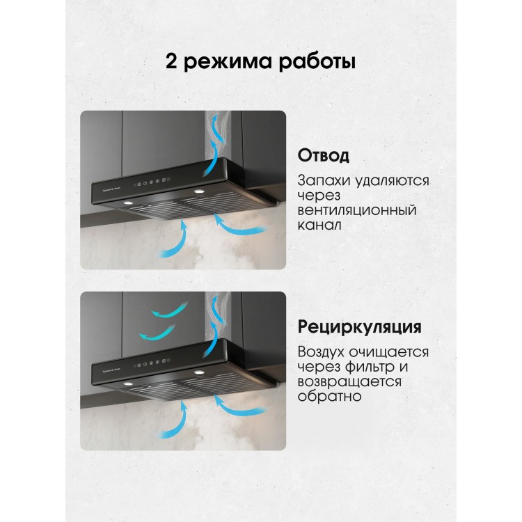 Эта модель также имеет таймер, который позволяет установить время работы вытяжки, и сенсорное управление, которое обеспечивает удобство и лёгкость в использовании.