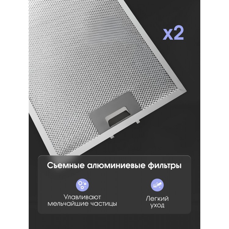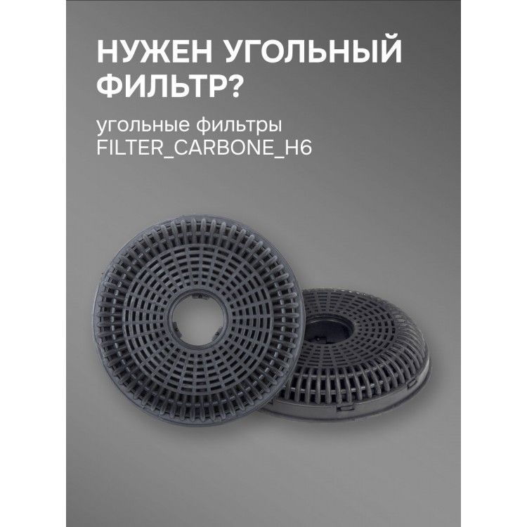 Вытяжка оснащена жировым фильтром, который защищает внутренние элементы от жира и грязи, а также угольным фильтром, который улавливает запахи.