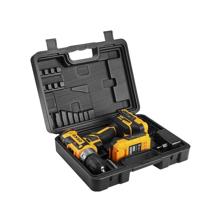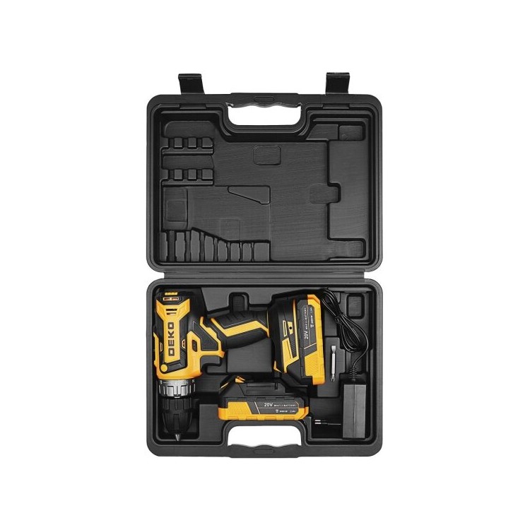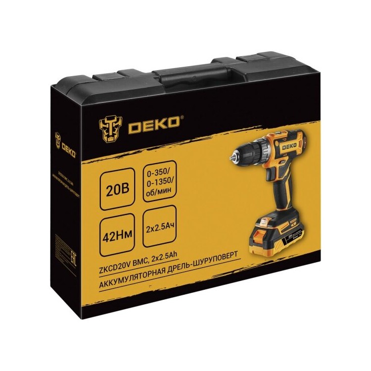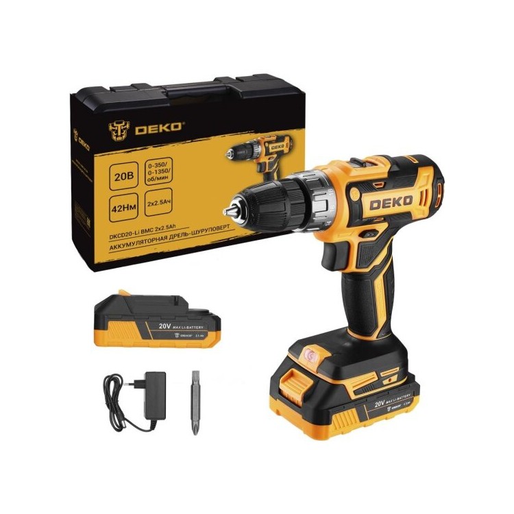 | Название | Дрель-шуруповерт аккумуляторная Deko DKCD20-Li в кейсе, 20В, 2х2.5Ач (085-1123) |