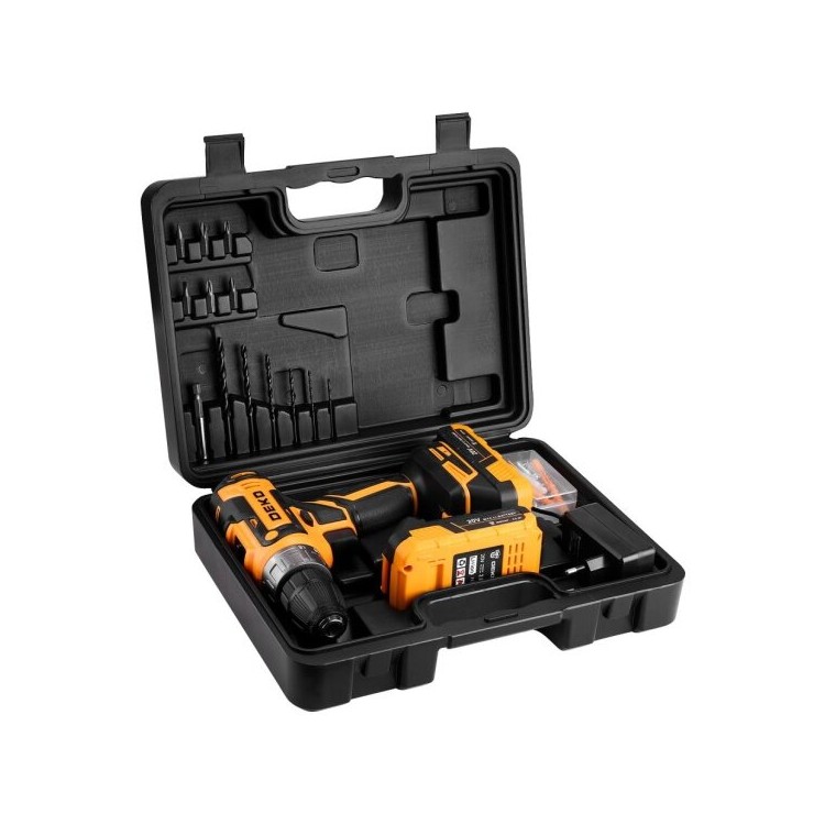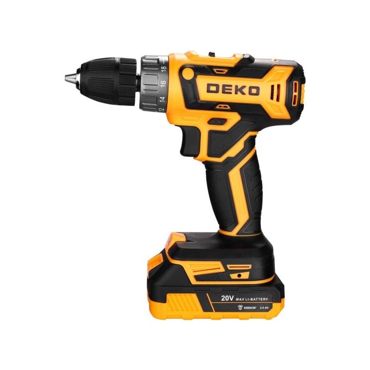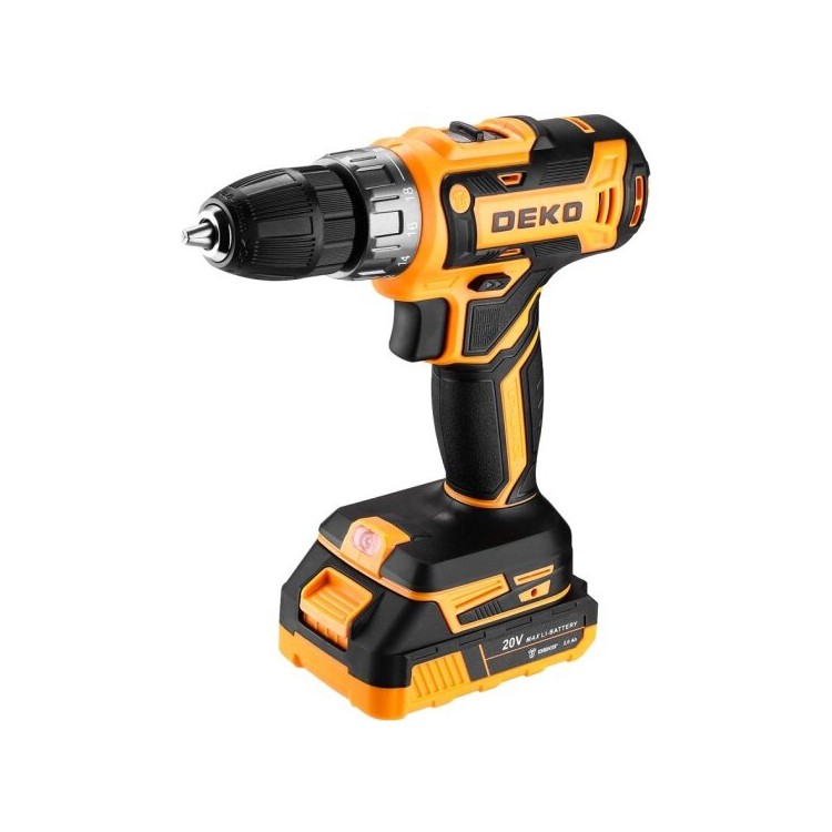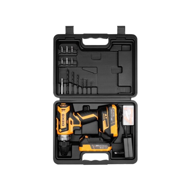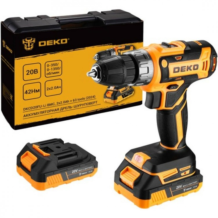 | Название | Дрель-шуруповерт аккумуляторная Deko DKCD20FU-Li в кейсе, 20В, 2x2.0 Ач + 63 предмета (063-4093) |