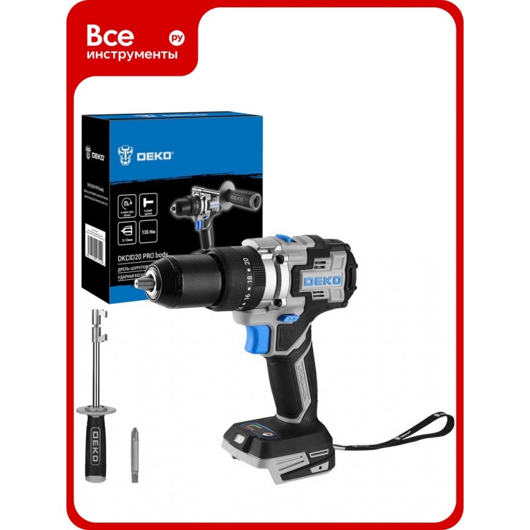 | Название | Дрель-шуруповерт аккумуляторная ударная бесщеточная DEKO DKCID20 PRO, 20В, без АКБ и з/у 063-4457 |
