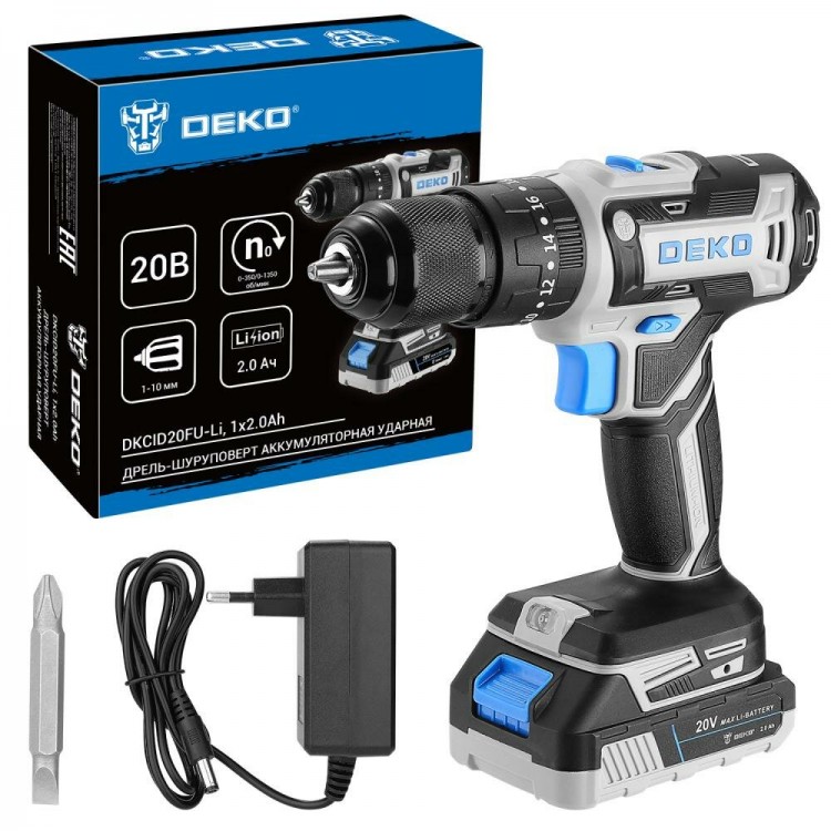 | Название | Дрель-шуруповерт аккумуляторная ударная DEKO DKCID20FU-Li 20В 1x2Ач 40Нм 083-1119 |