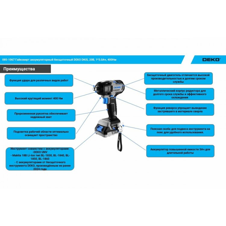 | Название | Гайковерт аккумуляторный бесщеточный DEKO DKIS, 20В, 1х3.0Ач, 400Нм 085-1067 |