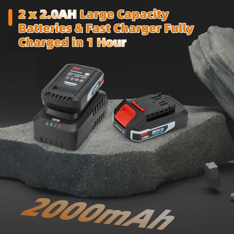 В комплекте идут два аккумулятора напряжением 20 В и ёмкость 2 А•ч, что обеспечивает непрерывную работу без перерывов на подзарядку.