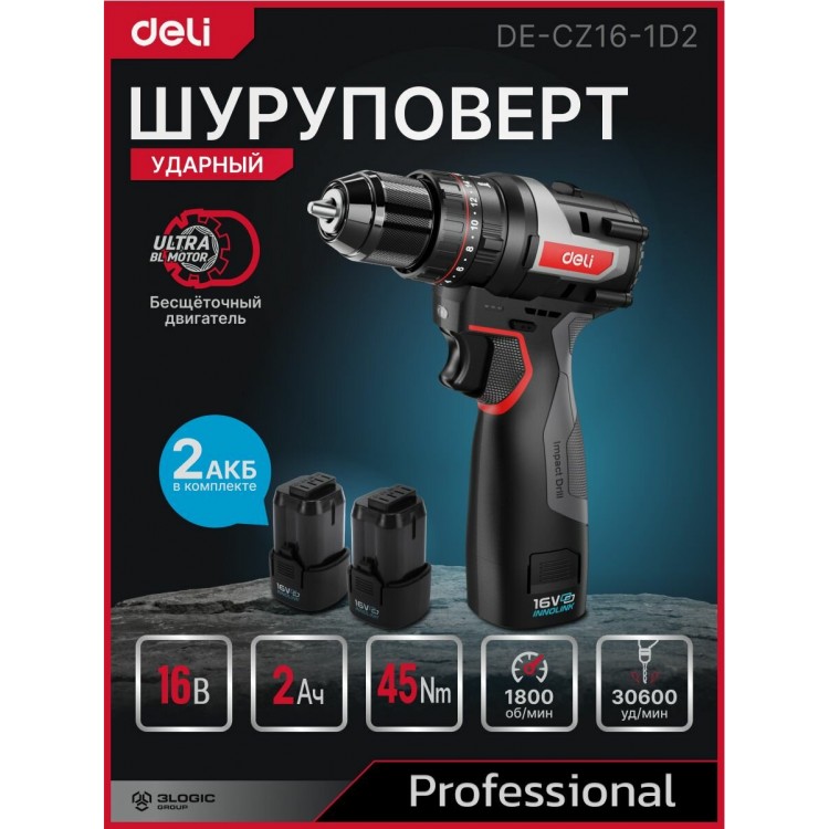 | Название | Дрель-шуруповерт аккумуляторная ударная Deli DE-CZ16-1D2 (2 акб, 16В х 2Ач, ЗУ, 45Нм, сумка) |