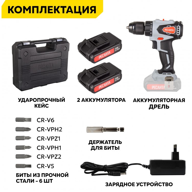 | Название | Дрель-шуруповерт аккумуляторная Ресанта ДА-20-2ЛК-Б (2,0 А/ч), безударный |
