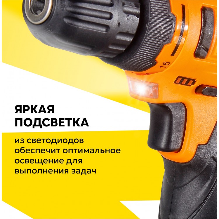 * Высокая мощность и производительность. Дрель-шуруповёрт работает от аккумулятора 12В, что обеспечивает высокую мощность и эффективность.