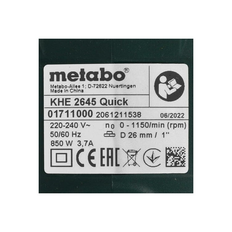 | В комплекте | Ограничитель глубины сверления, патрон перфоратора для инструментов с хвостовиком SDS-plus, перфоратор Metabo KHE 2645 Q 601711500, пластиковый кофр, прорезиненная дополнительная рукоятка |