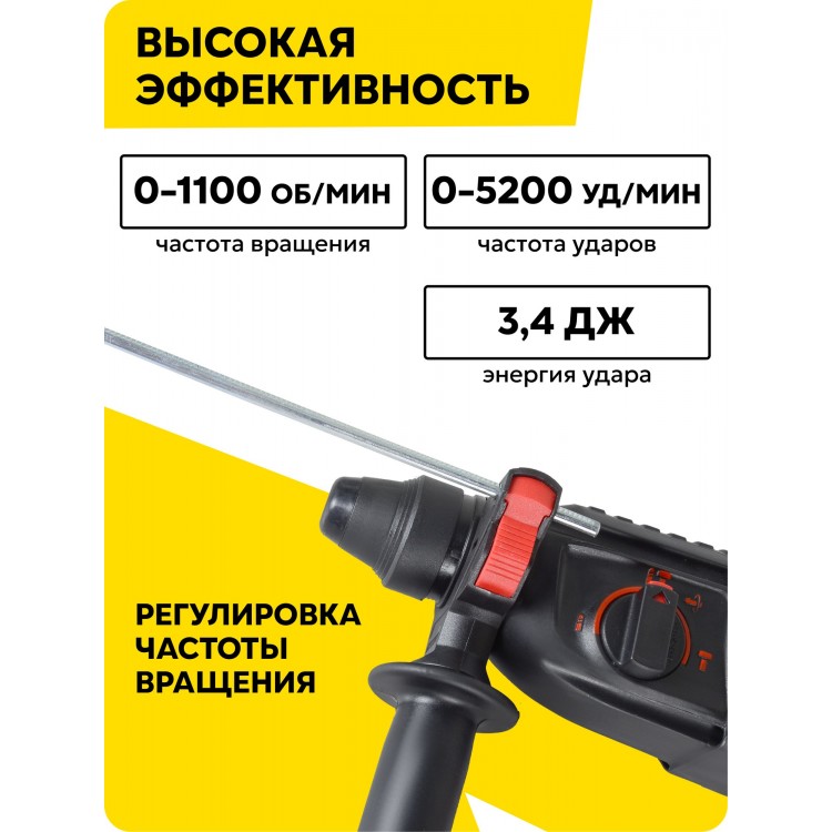 Частота ударов достигает 5200 ударов в минуту, а сила удара составляет 3,4 Дж. Это обеспечивает высокую производительность при работе с различными материалами, такими как дерево, кирпич, металл и камень.