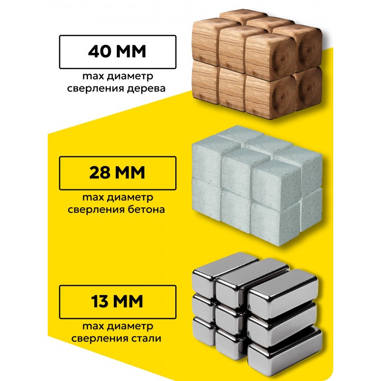 Максимальный диаметр сверления для дерева, кирпича, металла и камня составляет 40, 28, 13 и 28 миллиметров соответственно.