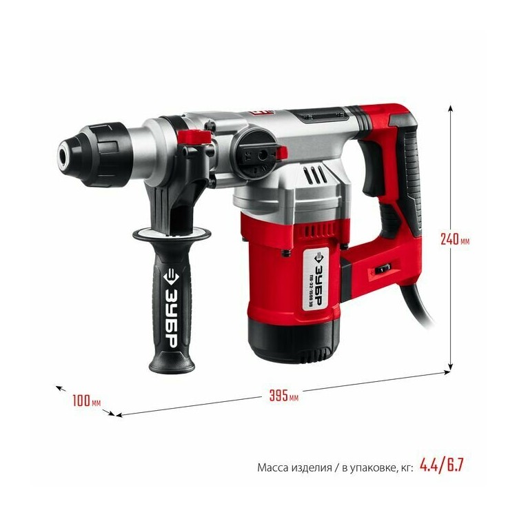 В комплекте с перфоратором ЗУБР ПВ-32-1500 ЭВ поставляется дополнительная рукоятка, глубиномер, смазка для бура, кейс и руководство по эксплуатации.