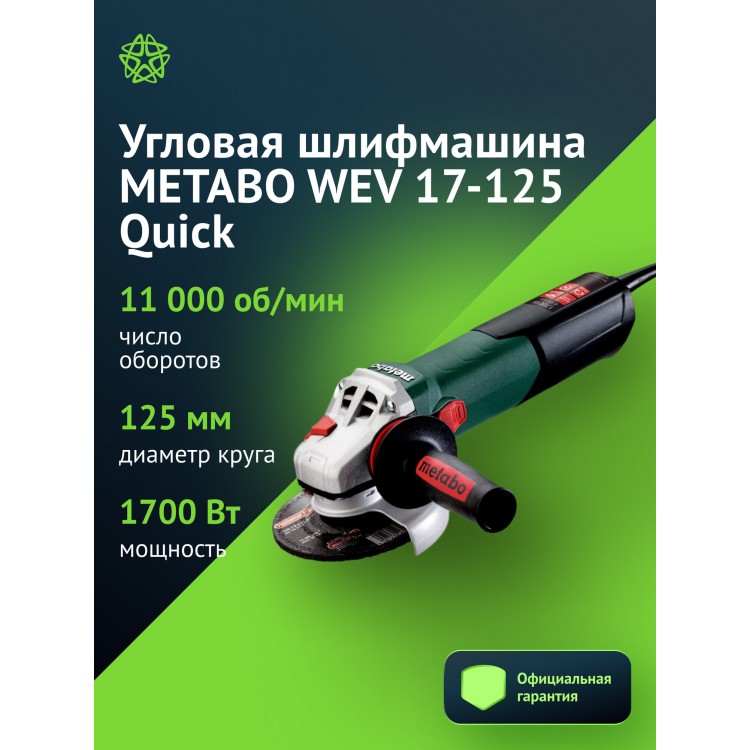 | Название | Угловая шлифмашина Metabo WEV 17-125 Quick, 1700Вт, диаметр шлифовального круга 125мм, скорость вращения 11000об/мин |