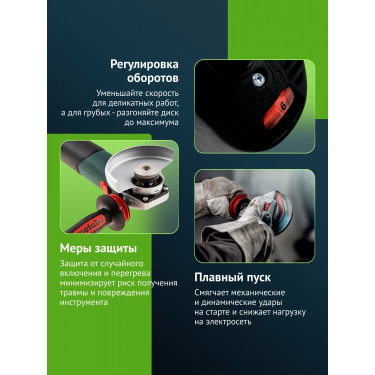 Угловая шлифмашина с регулировкой оборотов и плавным пуском позволяет выполнять широкий спектр работ. Благодаря системе M-Quick замена диска осуществляется без использования инструмента, что делает работу более удобной. Защита от непреднамеренного запуска и плавный пуск обеспечивают безопасность пользователя. А дополнительная рукоятка Metabo VibraTech снижает вибрацию и делает работу более комфортной.