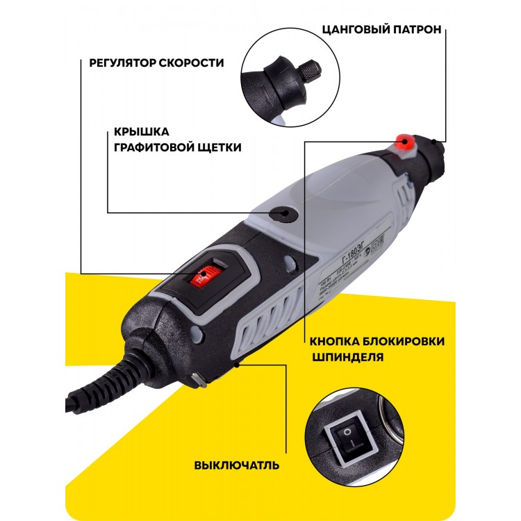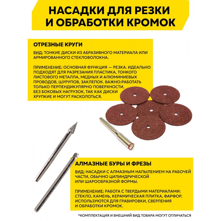 КРИТИЧЕСКАЯ дешевизна ВСЕЙ ОСНАСТКИ!!! Чемодан - мягкий (читай одноразовый) односторонний пластик, который продавливается под собственным же весом. Внутренности гравера, несмотря на вентиляционные отверстия и крыльчатку, при работе сильно греются. Это чувствуется при нагревании корпуса изнутри, особенно когда он поработал и выключен. Зажимной колпачок цанги выполнен из мягкого метала, который жуётся при первой же затяжке. Его не хватит надолго, где такой искать??? Да и затягивать-то собственно нечем: рога комплектного гаечного ключика разъехались в стороны и согнулись при первой же затяжке первой же комплектной насадки! Все насадки - так, для галочки, и оправдания цены. Зажимных цанг под другие размеры конечно же нет. Как нет и отрезных дисков по дереву/пластику (хотя в комплект положили несколько дисков по металлу, минимальная толщина которых заставляет опасаться за своё здоровье).
