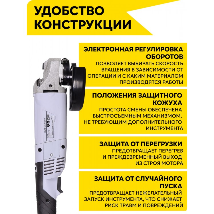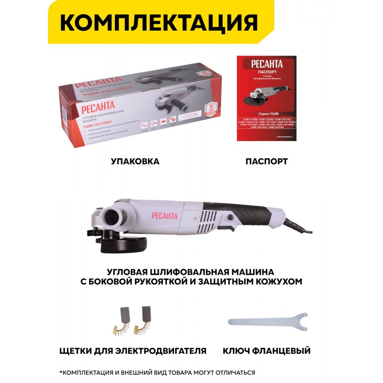 Название Болгарка 125мм, углошлифовальная машина, Ресанта УШМ-125/1400Э, 1400Вт; Бренд РЕСАНТА; Диаметр диска 125 мм; Потребляемая мощность 1400 Вт; Резьба шпинделя M14; Диаметр посадочного отверстия 22 мм; Максимальное число оборотов 12000 об/мин; Бесключевая замена оснастки Нет; Бесщеточный двигатель Нет; Особенности Дополнительная рукоятка, защита от перегрузки, защитный кожух, регулировка частоты вращения, фиксация шпинделя; Упаковка Коробка; Тип рукоятки Трехпозиционная; Длина сетевого кабеля 2 м; Вес 2.5 кг; Дополнительная информация Регулировка частоты вращения - для точной настройки под разные материалы; Гарантийный срок 2 лет, до 60 месяцев при условии только бытового применения. Для получения расширенной гарантии владелец обязан зарегистрировать инструмент на сайте компании РЕСАНТА в течение 1 месяца с момента покупки на официальном сайте компании Ресанта; Цвет серый;
