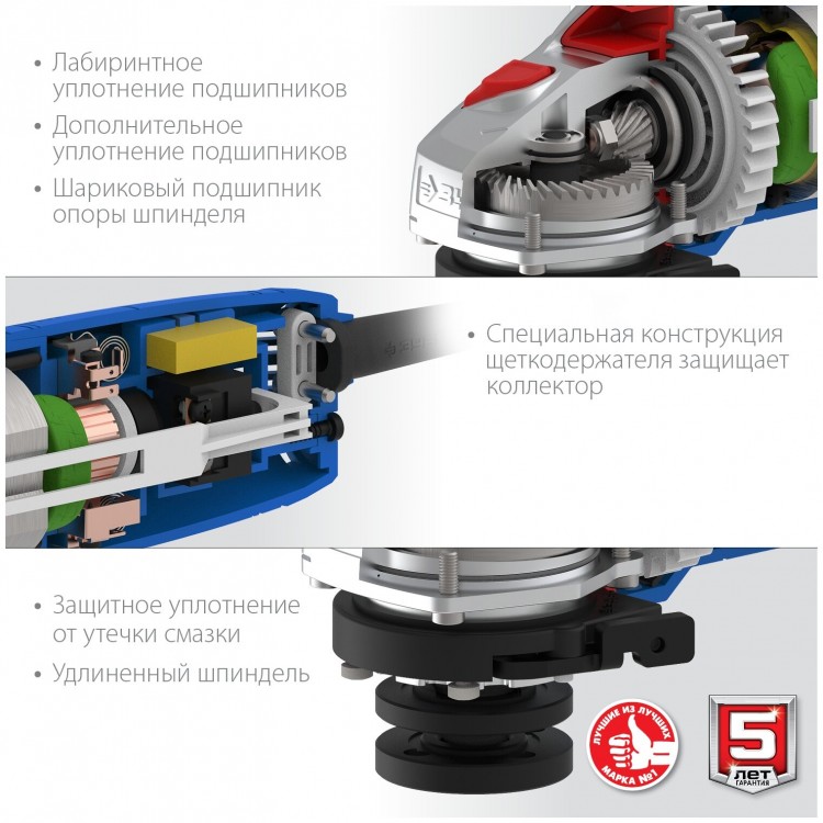 | Дополнительная информация | Дополнительные характеристики: - компактный и маневренный корпус, - усиленная пылезащита двигателя и подшипников, - лабиринтные уплотнения подшипников, - защищенный от пыли выключатель, - улучшенный теплоотвод редуктора, - направляющий диффузор системы охлаждения, - пониженный уровень шума, - удобная замена щеток, - резиновая изоляция кабеля, - фланцы из разнородных материалов, - защитный кожух с быстрой регулировкой, - эргономичная основная рукоятка, - шаг поворота головы 90 градусов |