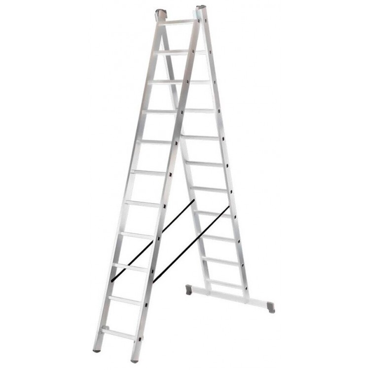 Двухсекционную лестницу приобрел для ремонтных работ в квартире. Лестница складная, на каждой секции по одиннадцать ступеней. Используем как лестницу и как стремянку. Благодаря пластиковым наконечникам, по полу не скользит. Пользоваться и хранить удобно.