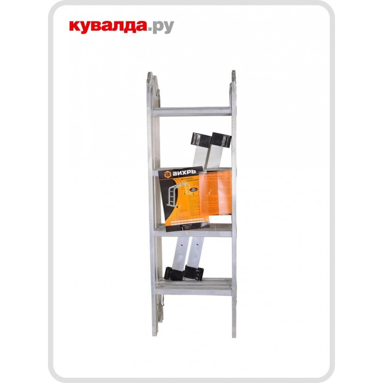 Очень устойчивая, легко меняет положения, состоит из 4-х секций, мы чаще всего используем как приставную, в полностью раскрытом состоянии, чтобы попасть на чердак или на крышу, еще возможна установка в виде стремянки, помоста и гармошкой. По весу не сильно тяжелая и прочная.