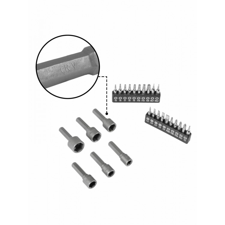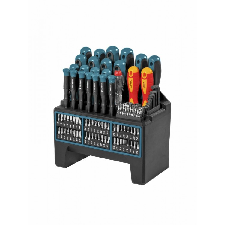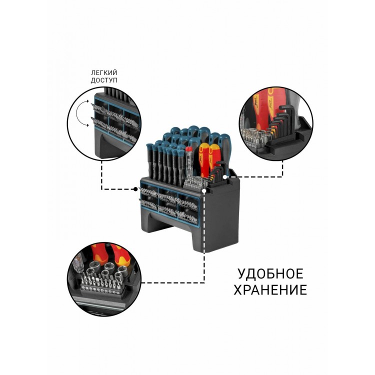 Набор станет незаменимым помощником в автомобильном, монтажном и электромонтажном деле. Материал — металл и пластик. В комплекте также есть тестер, адаптеры для бит и для бит для точных работ, отвёртка для шестигранных гаек и другие аксессуары. Нескользящее покрытие и удобный чехол для хранения делают набор ещё более практичным.