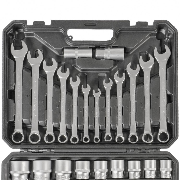 * Удобная комплектация: включает в себя набор гаечных ключей, головок, шестигранных ключей и другие инструменты.