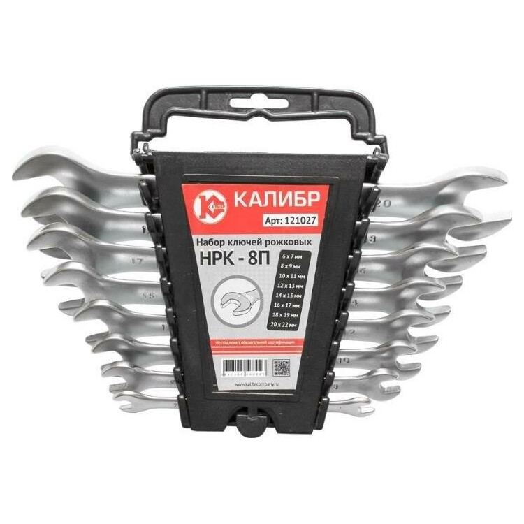 Набор рожковых ключей Калибр НРК-8П, арт.121027 состоит из 6 предметов. Каждый ключ изготовлен из высокопрочной CrV стали. Для удобства хранения набор комплектуется пластиковым подвесом. Рожковые ключи Калибр предназначены для работы с крепежом. Ключи: 6х7, 8х9, 10х11, 12х13, 14х15, 16х17, 18х19, 20х22 мм