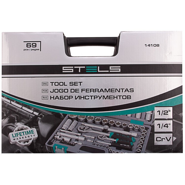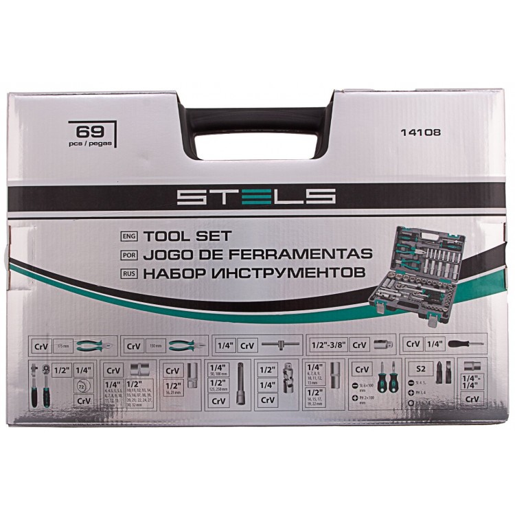 | Дополнительная информация | Набор инструментов STELS 69 предметов 14108 используется в автомастерских, а также для личного использования водителем при ремонте и обслуживании транспортного средства. Рабочие части ключей и головок выполнены из хромованадиевой стали. Биты и отвертки выполнены из стали S2. Набор из 69 предметов поставляется в удобном и прочном кейсе, который обладает ручкой для транспортировки и защелками |