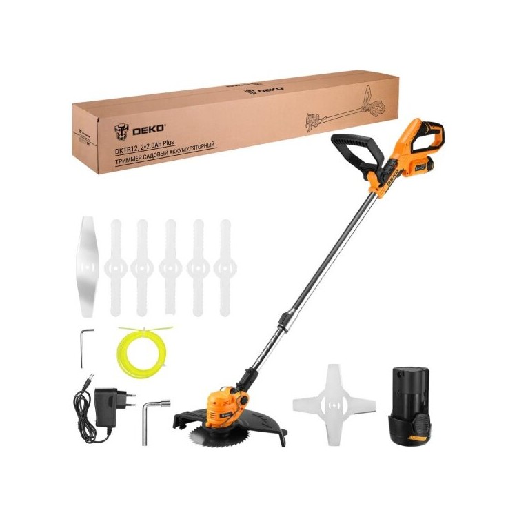 | Название | Триммер садовый аккумуляторный DEKO DKTR12 Pluse, 2х2.0 Ач, диск 40Т, диск 4Т, нож 2Т, пластикове ножи, катушка ручная с леской 1,5 мм, 085-2006 |