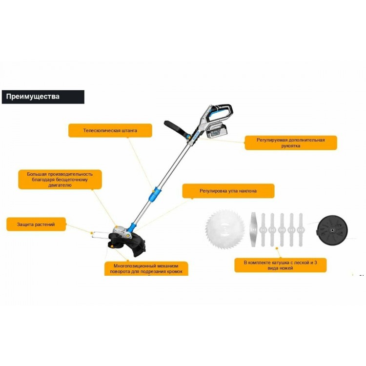 * Мощность и производительность. Триммер оснащён мощным двигателем, который позволяет легко справляться с густой травой и бурьяном.