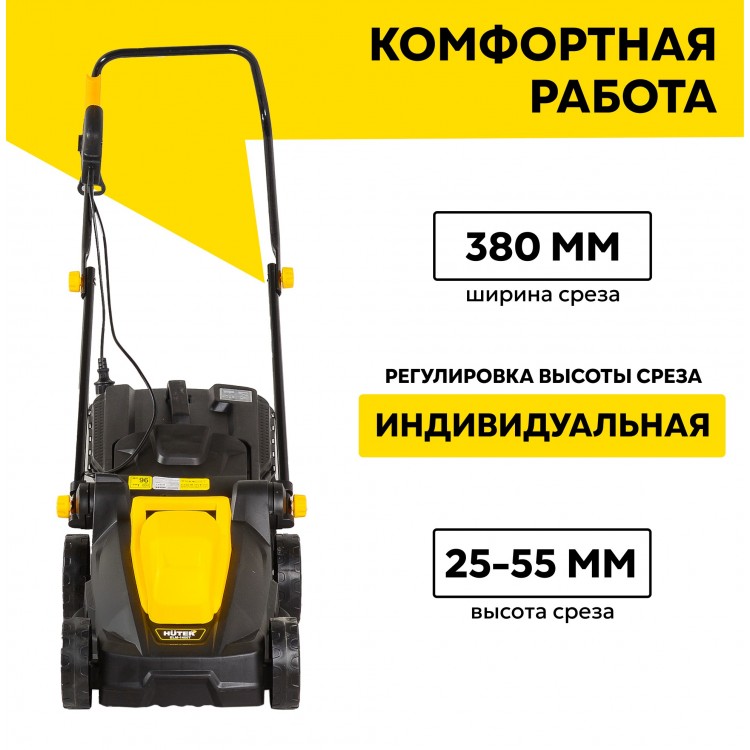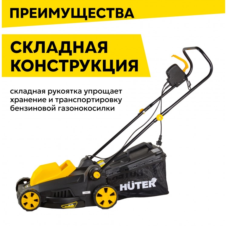| Название | Газонокосилка электрическая HUTER ELM-1400T, 1.4 кВт, ширина скоса 38см, тканевый травосборник на 35л |
