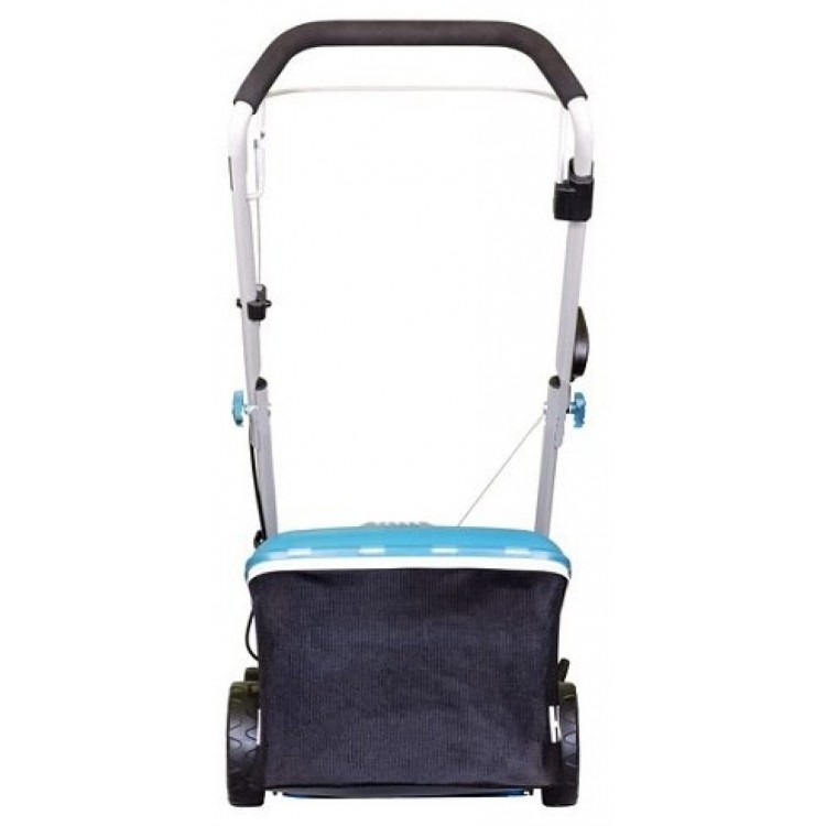 - Диаметр передних колёс 15 см, а задних — 18 см, что позволяет легко маневрировать по газону.