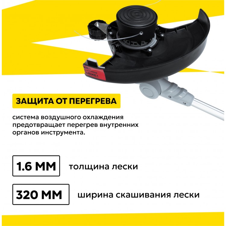 купила зимой, внешне нормальный. вот сейчас пришёл сезон использования. начали собирать. собрали в принципе быстро, д-образную ручку устанавливать обязательно, без неё вибрация отбивает поддерживающую руку напрочь. большие вопросы к защитному кожуху - он активно мешает косить, цепляется за грунт. если кожух оставлять, то рост косящего должен быть 190, при моих 160 вообще не зацепить траву. и самое главное, не смогли вынуть леску из катушки! при кошении надавливание на пружину не помогло, полезли смотреть. еле с матюками расковыряли защёлку, которая удерживает две половины катушки. леска была заспичена в пазы держателя. а обратно собрать вообще не смогли. в 4 руки удерживая металлические гайки, через которые продернута леска, чтоб не разбивала пластик, но сами гайки не закреплены никак, надавливаем на пружину, с третьего раза смогли удержать леску, не выронить гайки, не дать леске закрутиться на вал под катушку, накрыли крышкой и не смогли защелкнуть. вообще. совсем. хотела пристроить туда универсальную голову с другого триммера, поскольку у меня этих инвалидов порядочная коллекция, а у универсальной катушки резьба 10, а тут меньше... и оказалось, что использовать купленное невозможно совсем.