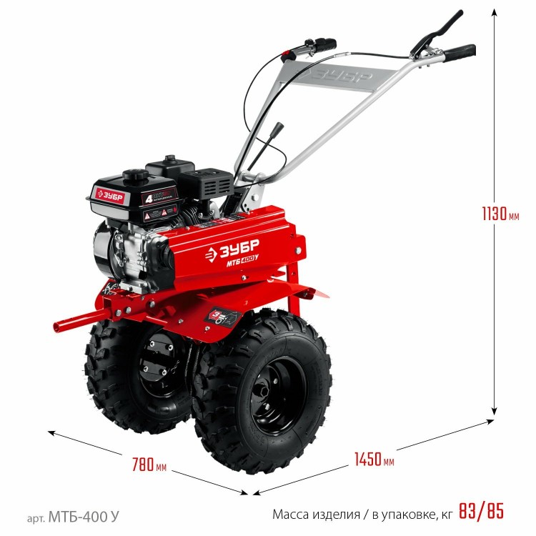 | Подробная комплектация | Бензиновый мотоблок с понижающей передачей ЗУБР, увеличенные колеса, 7 л.с. (МТБ-400 У) |