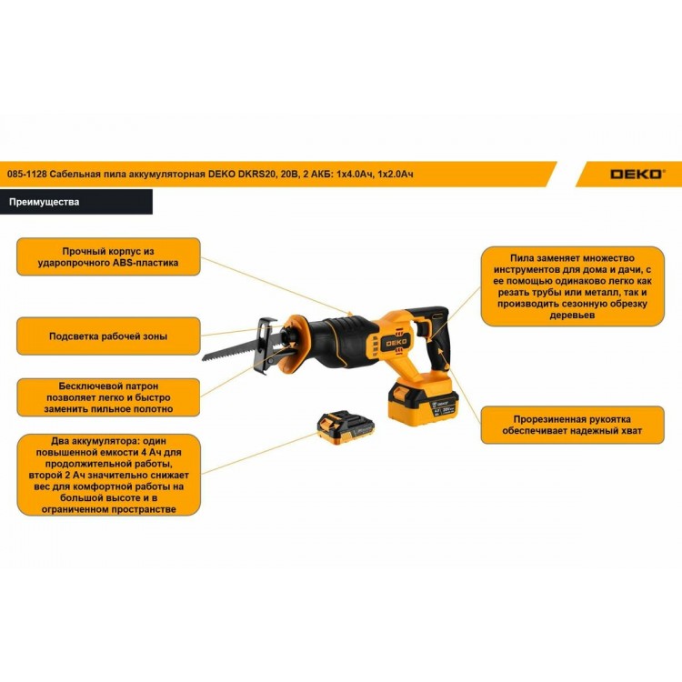 | Название | Сабельная пила аккумуляторная DEKO DKHS20 PRO 20В, 2 АКБ: 1x4.0Ач, 1x2.0Ач 085-1128 |