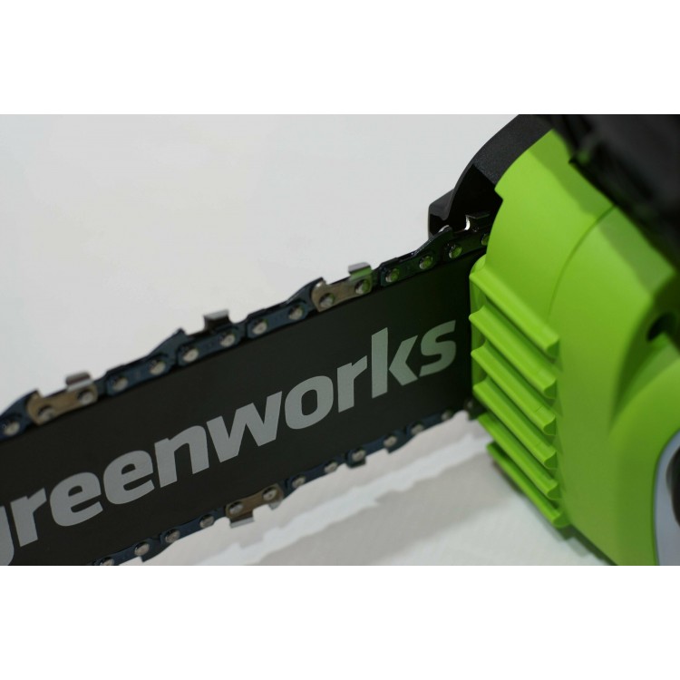 1. Питание от аккумулятора. Пила работает от аккумулятора Greenworks 24В — мощного и долговечного. Вы сможете работать без проводов, свободно перемещаясь по участку.