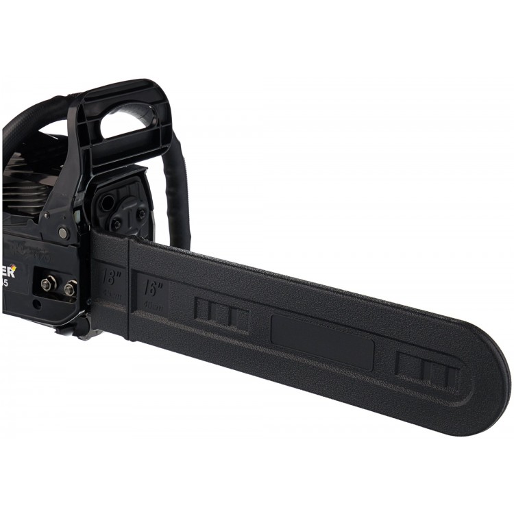 Длинная шинка, наточенная цепь прямо из коробки, мощности у нее с запасом, вместительный бак для бензина и масла (для смазки цепи)