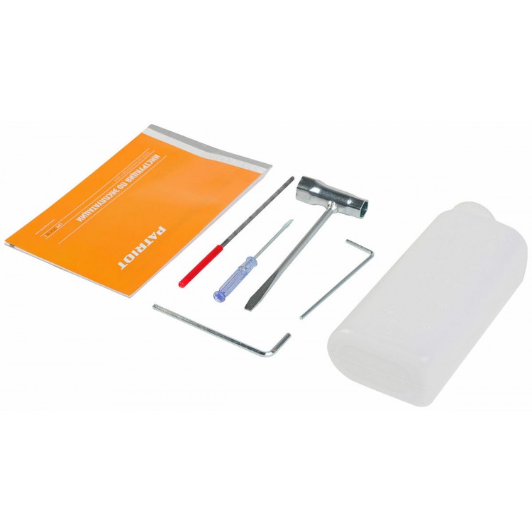 В комплект поставки входят: бензопила, шина, кожух шины, цепь, упор с комплектом крепежа, набор ключей, ёмкость для приготовления топливной смеси, инструкция и гарантийный талон.
