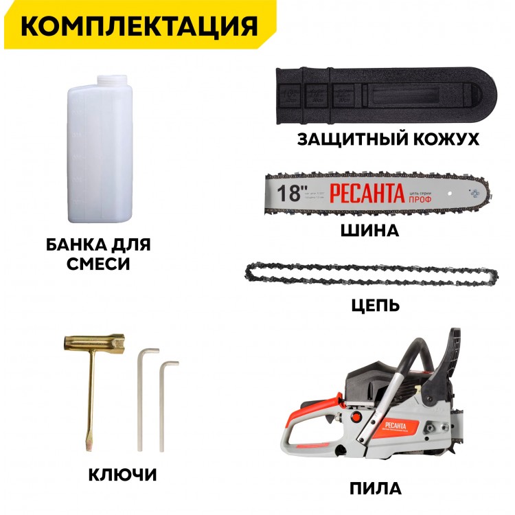 | Комплект поставки | Бензопила — 1 шт; Шина — 1 шт; Цепь — 1 шт; Защитный кожух шины — 1 шт; Ёмкость для смешивания топливной смеси — 1 шт; Комплект инструментов и принадлежностей – 1 шт; Руководство по эксплуатации |