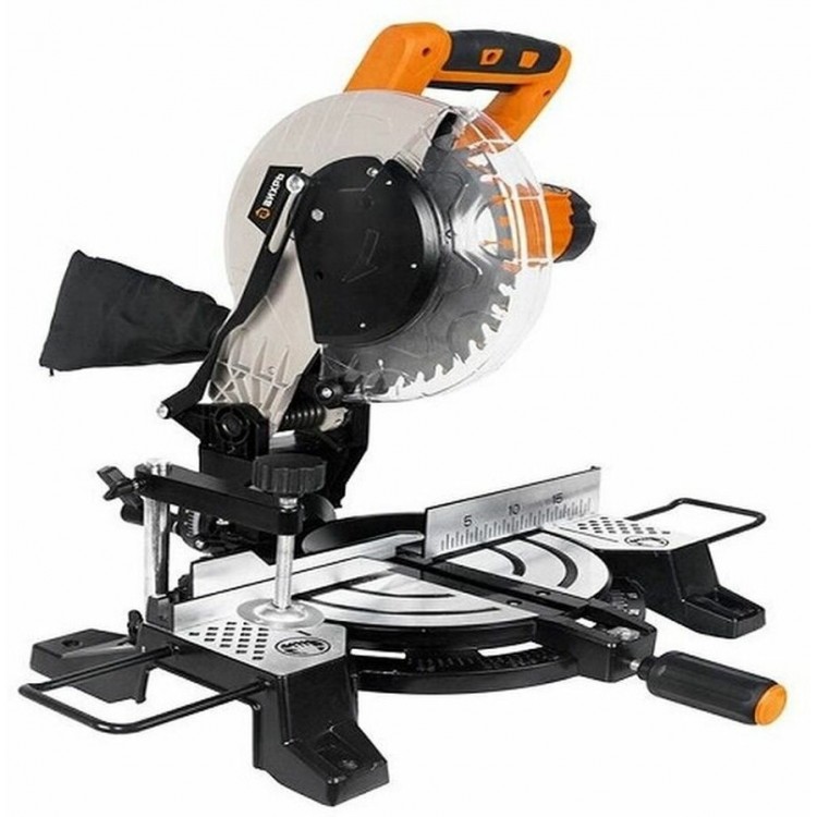 Мощный двигатель, пилит быстро и ровно. Прочная конструкция, не вибрирует при работе. Удобная шкала для установки углов.