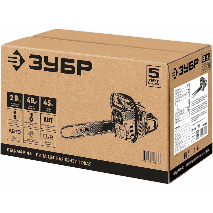 | Комплект поставки | Пила Зубр ПБЦ-М49-45, шина, цепь пильная, кожух шины, ключ универсальный, ключ имбусовый (2 шт.), зубчатый упор, емкость для смешивания, дополнительная катушка стартера, руководство по эксплуатации |