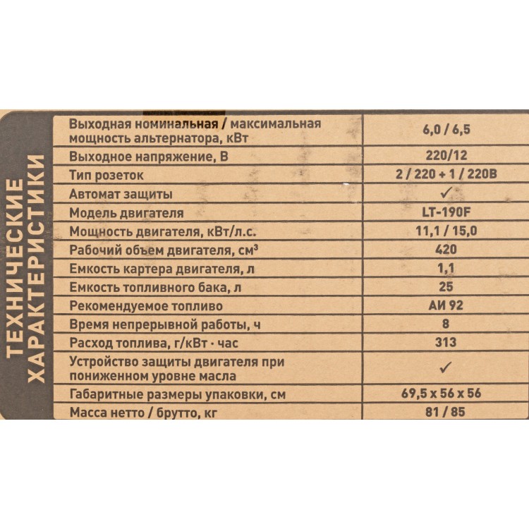 | Особенности | Автомат защиты; Устройство защиты двигателя при пониженном уровне масла; Медные обмотки альтернатора |