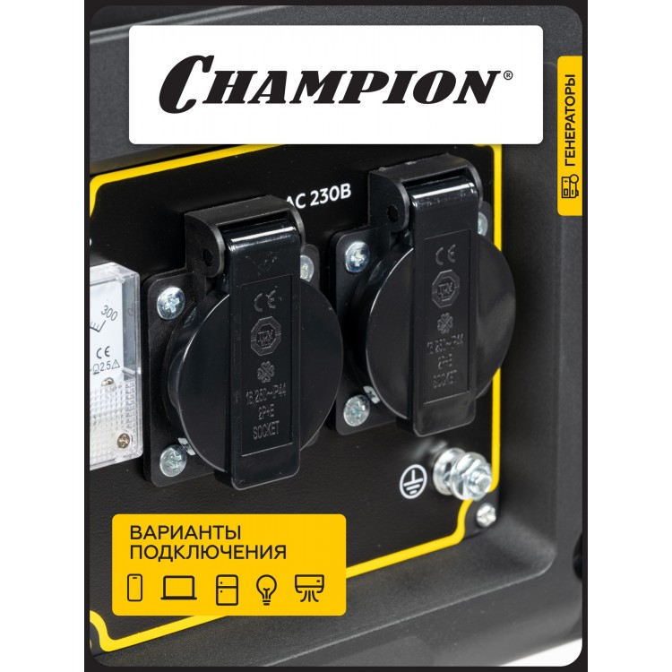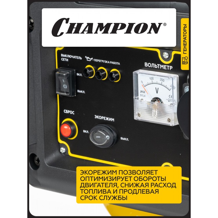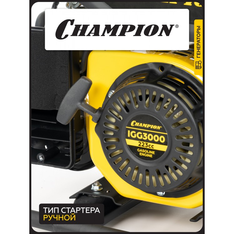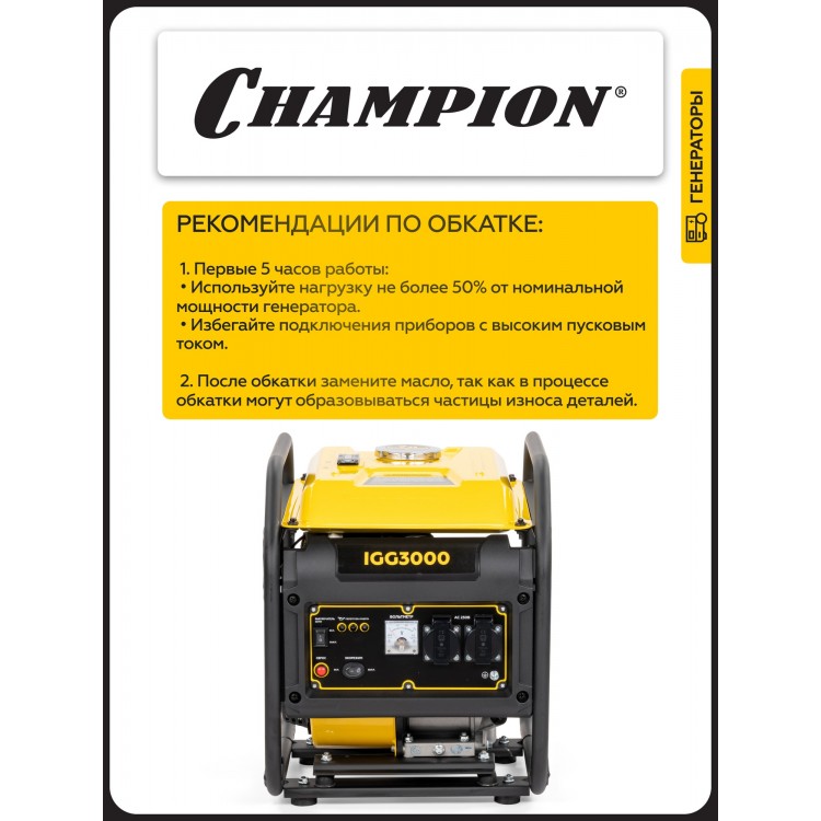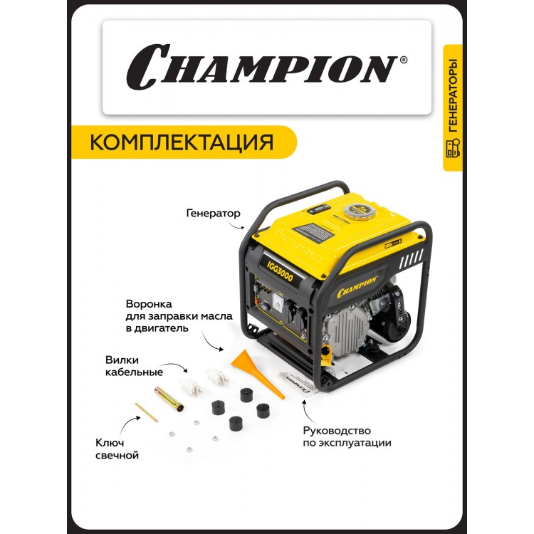 | Название | Генератор инверторный CHAMPION IGG3000 (2,8/2,9кВт, 7,5лс, 7л, 26кг) |