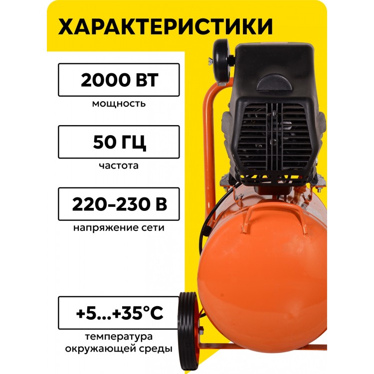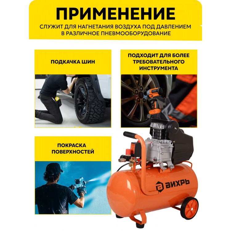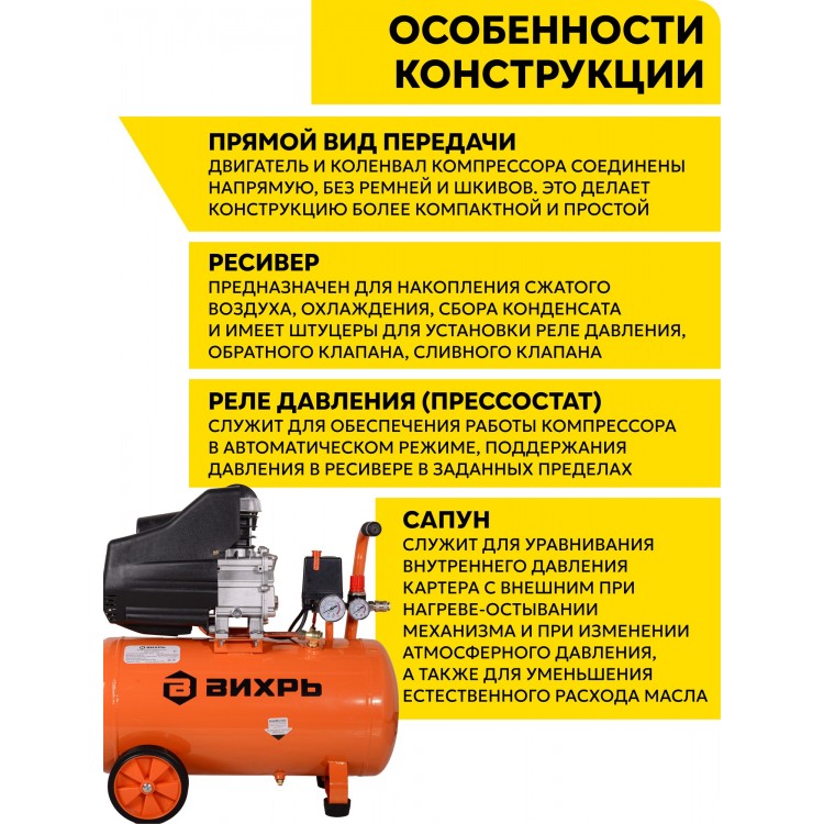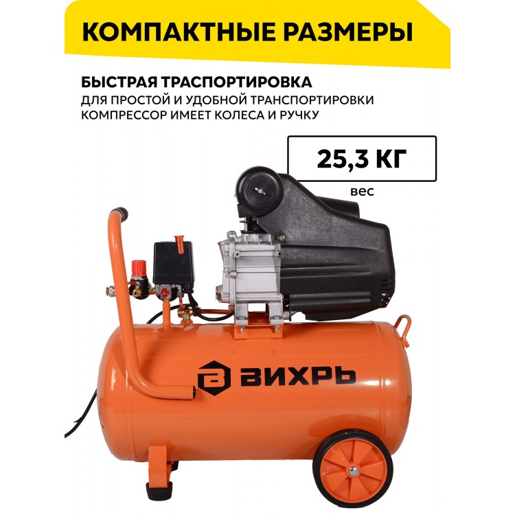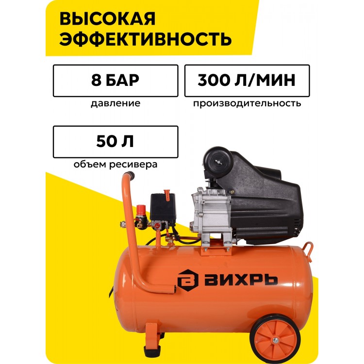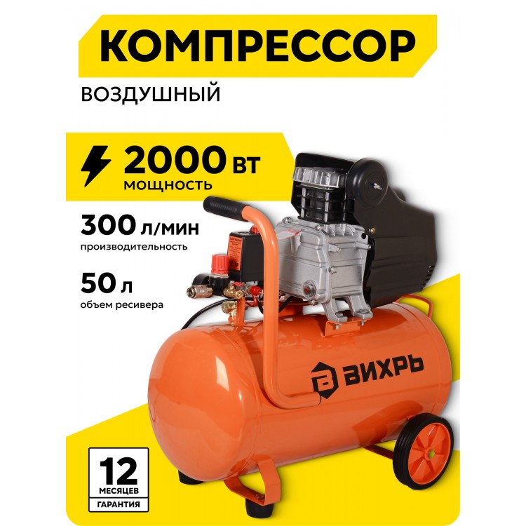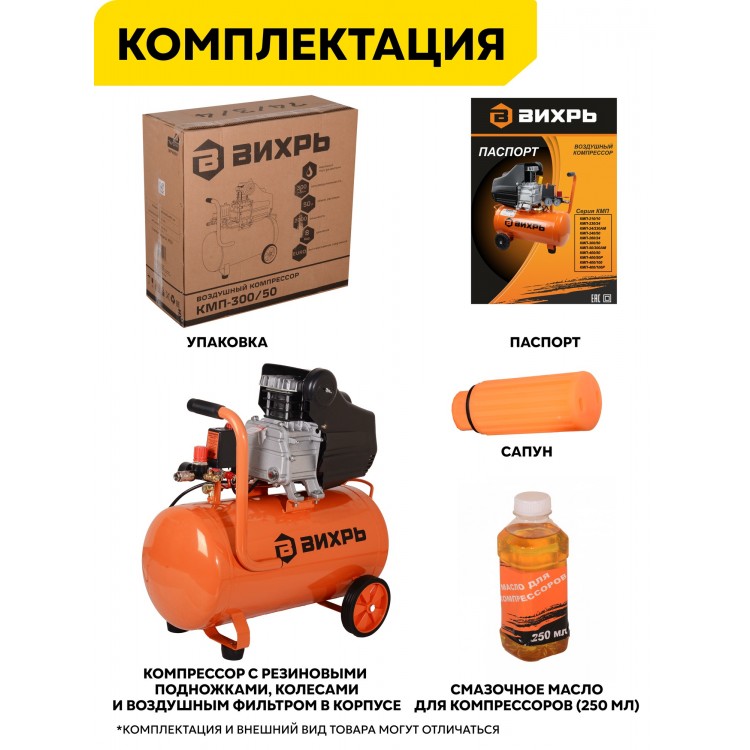 Компрессор Вихрь КМП-300/50 имеет горизонтальный ресивер объёмом 50 л. Напряжение устройства — 220 В, а уровень шума не превышает 80 дБ. Коаксиальный (прямой) привод обеспечивает надёжную работу компрессора. В комплекте с ним идёт кабель питания.