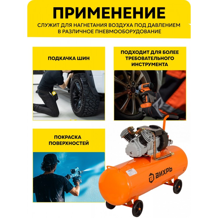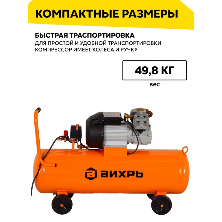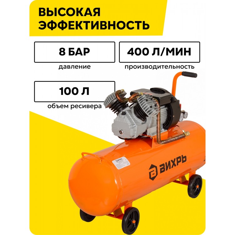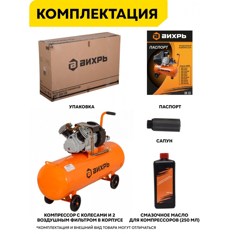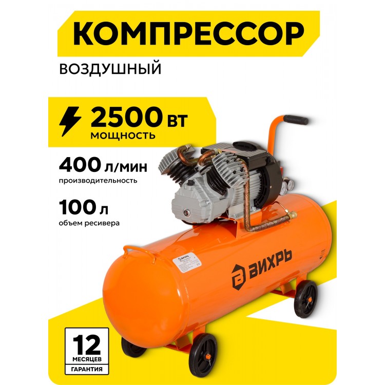 | Название | Компрессор воздушный, 100л, Вихрь КМП-400/100, 2500 Вт, 8 Бар |