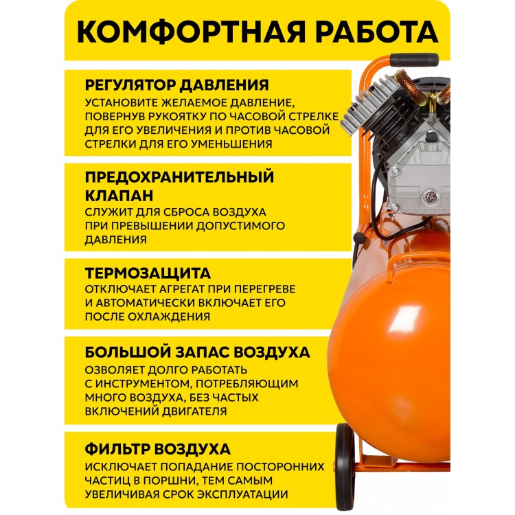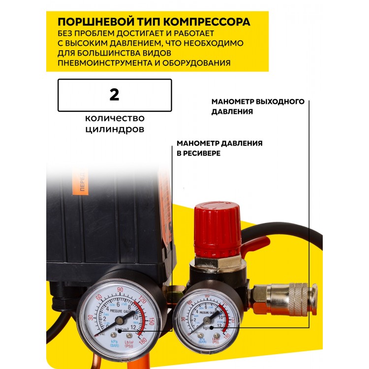 Особенности модели: защита от перегрева, индикатор уровня масла, манометр, предохранительный клапан, регулировка давления и удобная ручка для переноски. В комплекте также идут колёса, резиновая подножка, воздушный фильтр, сапун, смазочное масло (250 мл) и руководство по эксплуатации.