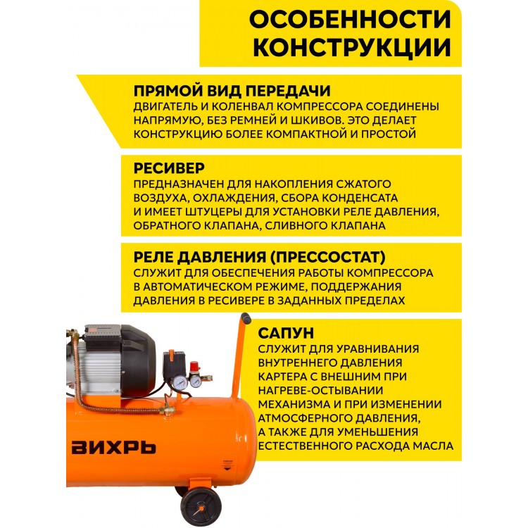 Компрессор Вихрь КМП-400/100 имеет коаксиальный (прямой) привод и работает от напряжения 220 В. Уровень шума не превышает 80 дБ, что делает его комфортным в использовании.