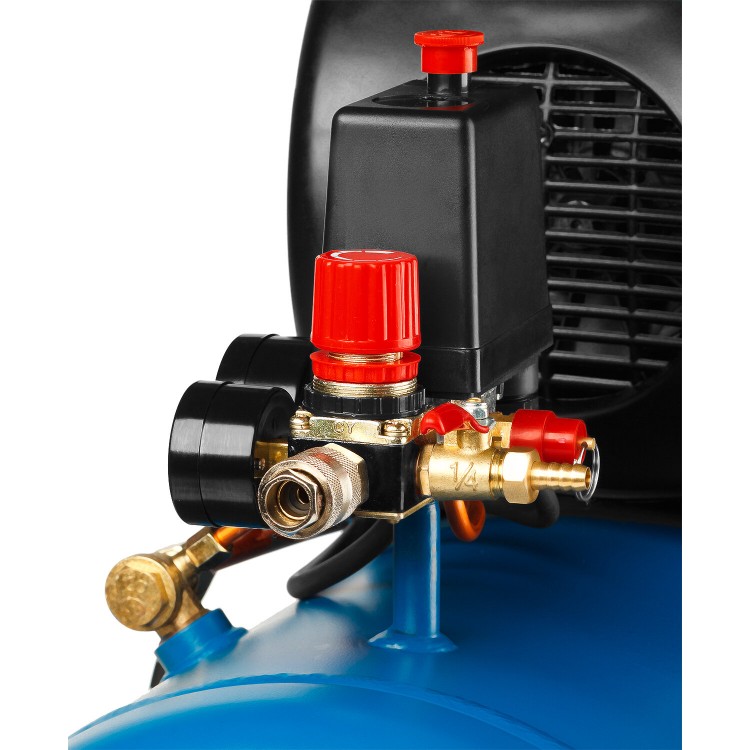 Объём ресивера составляет 50 л, что обеспечивает стабильную работу инструмента. Максимальное число оборотов — 2850 об/мин. Устройство оборудовано двумя постами и типом соединения Рапид (евро)/ёлочка. Уровень шума — 92 дБ.