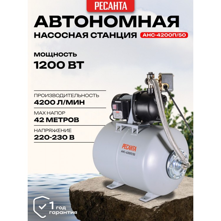 | Название | Автономная насосная станция Ресанта АНС-4200П/50, 1200 Вт, напор – 42 м, 70 л/мин, гидроаккумулятор – 50 л |