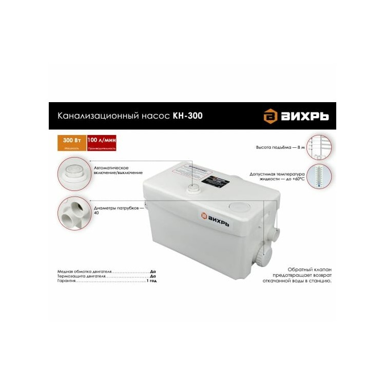 Готов был заплатить и большую цену, чтобы решить проблемы с канализацией. Сантехник с большим опытом посоветовал не переплачивать и купить Вихрь Кн-300. Подключил канализационный насос к общему сливу. Все сантехническое оборудование расположено далеко от стояка. Без этой установки вода самотеком не уходила. Сейчас откачивает из кухни, унитаза, стирального автомата.